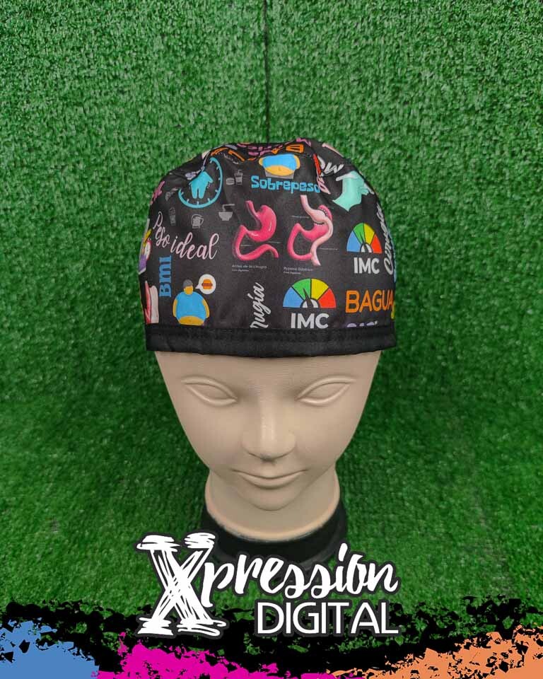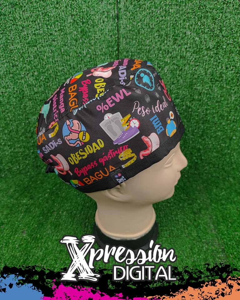 Un diseño pensado para especialistas 👨⚕️👩⚕️. Este gorro quirúrgico combina un fondo negro elegante con ilustraciones coloridas relacionadas con la nutrición, el IMC (Índice de Masa Corporal) y la cirugía bariátrica. Incluye gráficos de balanzas, siluetas corporales, estómagos ilustrados y escalas de peso, transmitiendo profesionalismo y conocimiento en el área de la salud. Fabricado en tela ligera, cómoda y resistente, es ideal para médicos bariátricos, nutricionistas y cirujanos que buscan llevar su sello profesional hasta en los detalles.